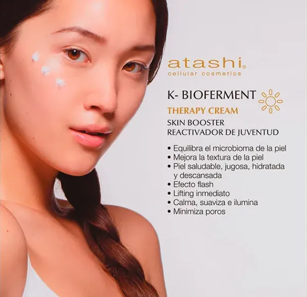 Atashi K-Bioferment Therapy Cream es un pretratamiento de día energético antiedad, revitalizante y multicorrector para pieles sin descanso y sometidas a estilos de vida agotadores, Prepara tu piel antes de aplicar tu tratamiento habitual o maquillaje a modo de prebase de maquillaje o prebase iluminadora.