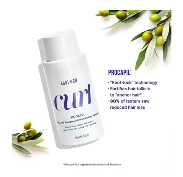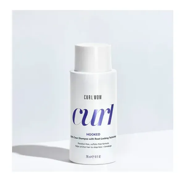 El Champú Color Wow Hooked 100% Clean Curl con tecnología Root-Locking con una fórmula sin residuos ni sulfatos ayuda a anclar el cabello para evitar la caída + reducir la rotura.