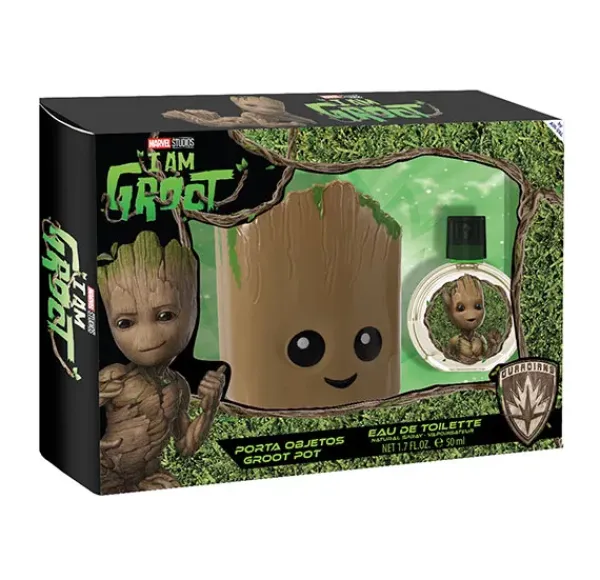 El estuche de Groot contiene una fragancia dulce con notas de vainilla en formato 50 ml y un adorable portaobjetos para organizar y decorar tu mesa de estudio.