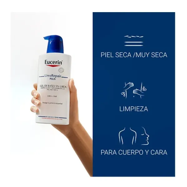 Eucerin UreaRepair PLUS Gel de Baño 5% Urea contiene agentes de higiene muy suaves, lo que lo convierte en un gel idóneo para limpiar la piel seca a extremadamente seca. Además, está enriquecido con urea y factores naturales de hidratación que retienen la humedad en el estrato córneo (la capa superior de la piel). La fórmula es ideal para la higiene diaria, ya que hidrata la piel y reafirma la función de barrera natural.