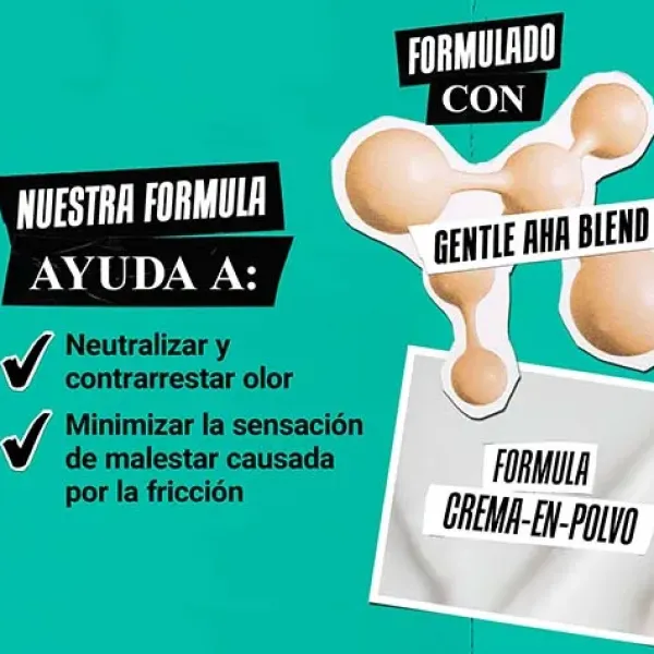 Su fórmula contiene una mezcla de AHAs suave para neutralizar el olor en las áreas sensibles e íntimas del cuerpo.