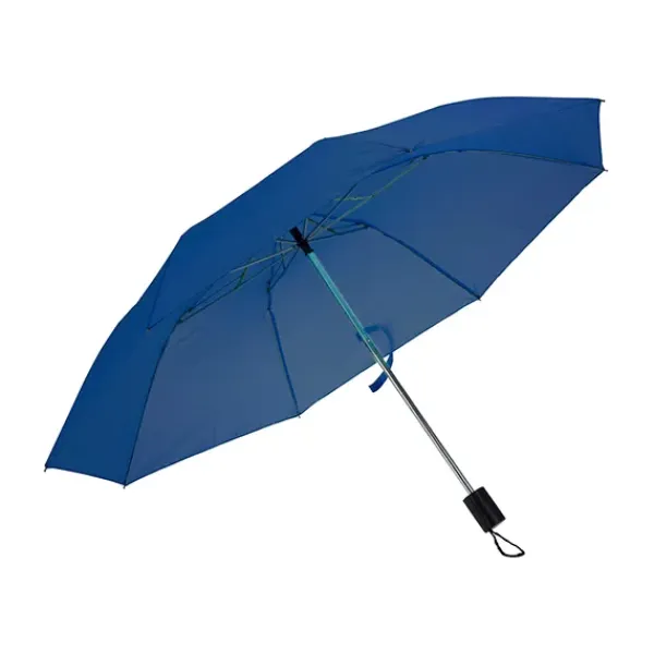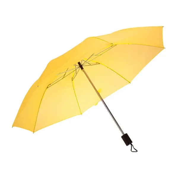 Paraguas plegable de 21 pulgadas con funda de poliéster. Manual con pomo de PP negro, con funda de metal extra, cada uno en bolsa, poliéster. Colores: negro, menta, rosa, amarillo y azul.