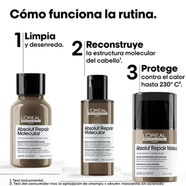 Y la Mascarilla sin aclarado Absolut Repair Molecular, también con la tecnología de reparación de enlaces y 5 aminoácidos esenciales, sella la reparación y proporciona una protección duradera. Esta mascarilla deja el cabello suave, brillante y completamente revitalizado, protegiéndolo de futuros daños.