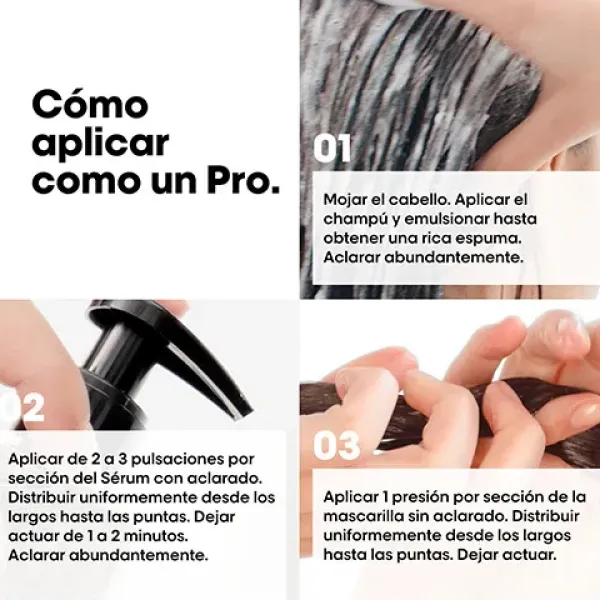El Sérum con aclarado Absolut Repair Molecular, que complementa la acción del champú con su fórmula avanzada que combina un 2% de Reparador de enlaces con 5 Aminoácidos. Este sérum penetra profundamente en la fibra capilar, intensificando la reparación y dejando el cabello aún más resistente y revitalizado.