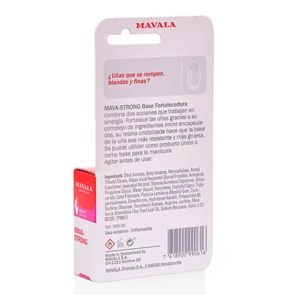 La Base Fortalecedora Mava-Strong permite acabar con las uñas finas y que se rompen para conseguir así unas uñas naturales y fuertes. Combina dos acciones que trabajan en sinergia: fortalecer y proteger. Es un esmalte de uñas incoloro y con brillo, cuyos ingredientes activos de eficacia y tecnología avanzada mejoran la calidad de las uñas, haciéndolas más fuertes. Su complejo de micro ingredientes encapsulados (aceite esencial de árbol de té, vitamina E, queratina hidrolizada y arginina) fortalece las uñas y su resina cristalina hace que la superficie de la uñas sea más resistente y gruesa.