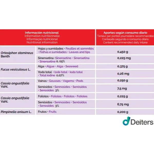 Cada sobre-filtro de Redugras contiene: Ortosifón 0,45 g, fucus 0,375 g, vainas de sen 0,25 g, foliolos de sen 0.225 g y frutos de anís 0,075 g.