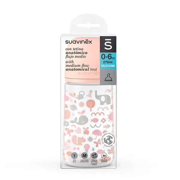 Biberón Suavinex para bebés 0-6 meses con tetina anatómica flujo medio de silicona. Capacidad 270ml.