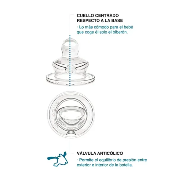 Su válvula anticólico en la base de la tetina evita las molestias, como el hipo y los cólicos, que pueden derivarse de la ingesta de aire.
