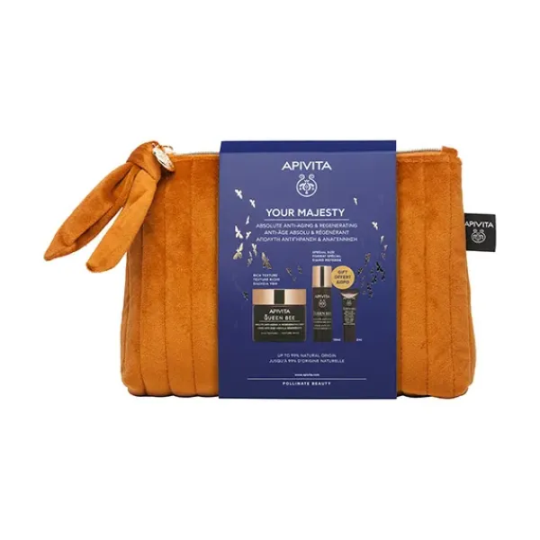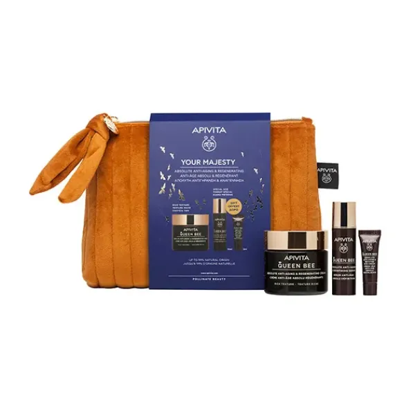El cofre para el cuidado facial definitivo para una acción antiedad y regeneradora absoluta con QUEEN BEE Crema Regeneradora Antiedad Absoluto – Textura Rica, formato especial QUEEN BEE Sérum Redensificante Antiedad Absoluto y formato especial QUEEN BEE Contorno de Ojos Revitalizante Antiedad Absoluto.