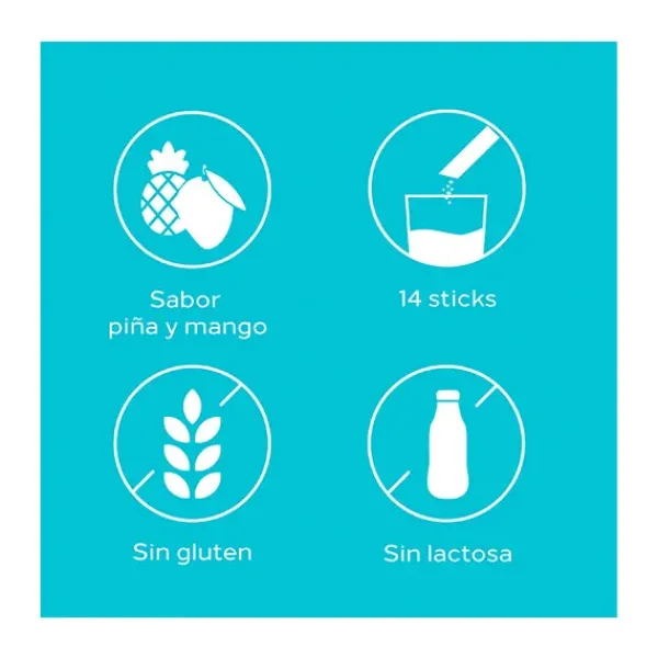Incluye 14 sticks. Sabor a piña y mango. Sin Gluten, Sin Lactosa, Sin Azúcares.
