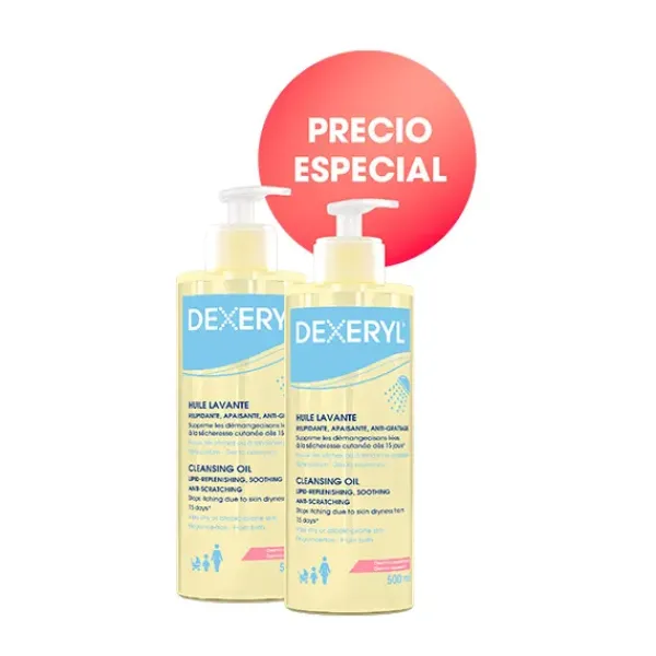 La piel seca o atópica puede irritarse con los jabones y el agua. Dexeryl Aceite limpiador está diseñado especialmente para limpiar suavemente, calmar y relipidar las pieles secas, muy secas o con tendencia atópica, a la vez que protege la barrera cutánea. Elimina el 100 % del picor en 15 días, hidrata y relidipida la piel de toda la familia. Su fórmula sin perfume y sin jabón es adecuada desde el nacimiento. Su textura fluida es agradable de aplicar y crea una espuma ligera y suave en la piel, fácil de aclarar.