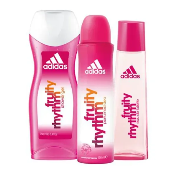 Set de Adidas Fruity Rhythm para mujer. Contiene Adidas Fruity Rhythm Eau de Toilette de 75ml, Body Spray 150ml & Adidas Fruity Rhythm Gel de Ducha de 250ml.