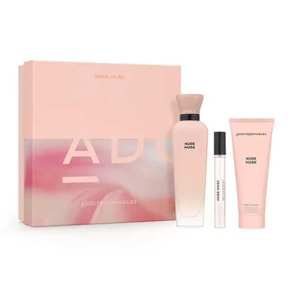El estuche de regalo Nude Musk de Adolfo Domínguez para mujer se compone de Eau de Parfum (perfume de 120 ml + 10 ml) y crema de manos.