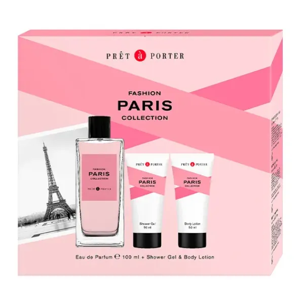 El set de regalo PARIS de la colección Fashion Collection de Prêt à Porter, incluye Eau de Parfum 100ml, junto con un Gel de ducha y Body Lotion de 50ml. Esta Eau de Parfum para mujer es una seductora fragancia floral de rosas. Paris se abre con una jugosa mezcla de notas de grosella negra y mandarina con un toque picante de pimienta rosa. El corazón revela un exquisito acorde de macaron de Ispahan envuelto en un bouquet floral de rosa y jazmín. Por último, la fragancia se asienta en una sofisticada firma de maderas con cálidos tonos de almizcle y ámbar.