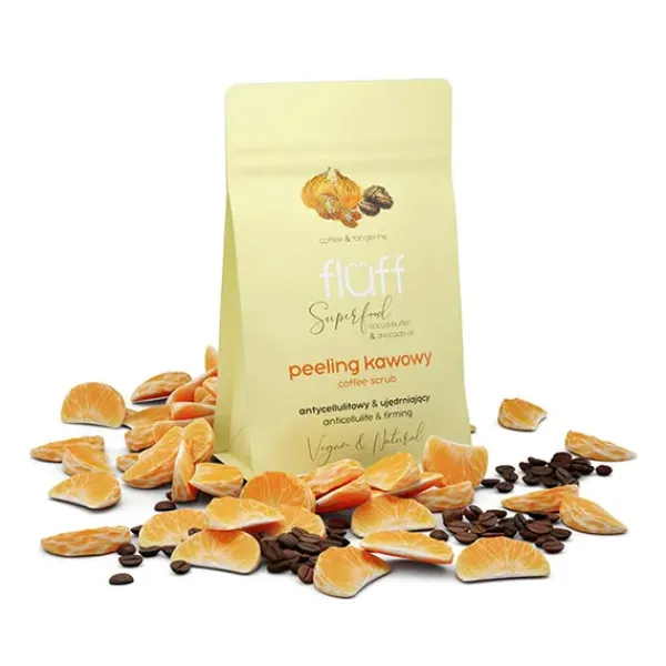Fórmula de peeling seco reafirmante y anticelulítico con ingredientes 100% de origen natural: café robusta natural con azúcar moreno, semilla de fresa y vitamina E, aceite de almendras dulces y aceite de aguacate.