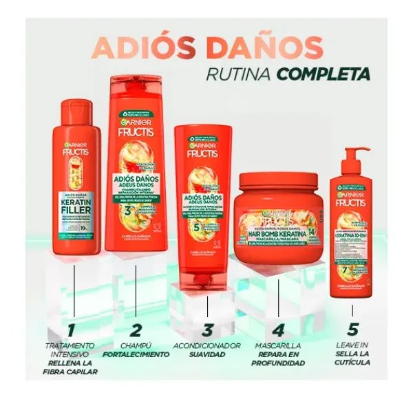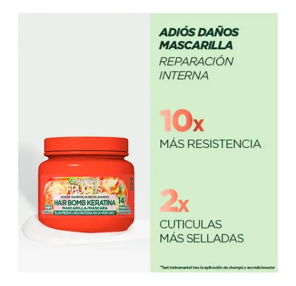 El Aceite de Marula, conocido por sus propiedades nutritivas, se fusiona con la keratina para crear una combinación potente que no solo repara profundamente tu cabello, sino que también le proporciona 10 veces más resistencia*. Con la Mascarilla Adiós Daños de Fructis, dile adiós a los daños y experimenta la magia de un cabello reparado y fortalecido. *Test instrumental