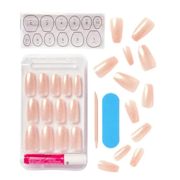 Contiene 24 uñas, 24 pestañas megaadhesivas, pegamento de gel rosa (2g), stick de manicura y mini lima.