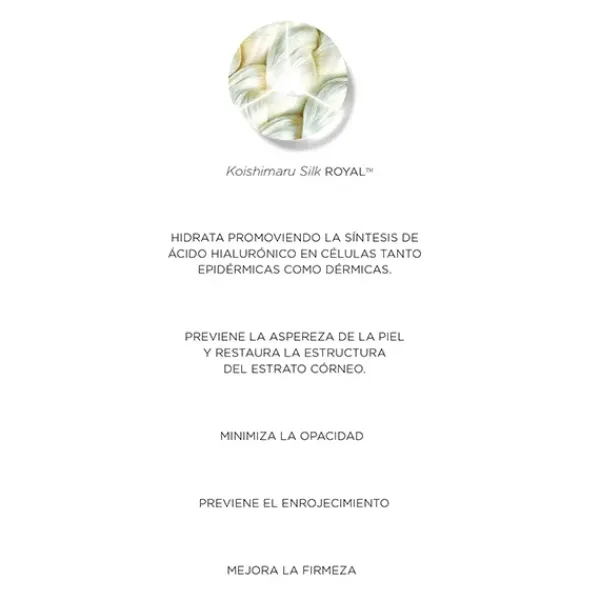 Los ingredientes del extracto de Koishimaru Silk RoyalTM, infunden a la piel los poderes divinos de la Seda Koishimaru, para prevenirla de las rojeces, calmarla y liberar una apariencia uniforme, suave y luminosa.