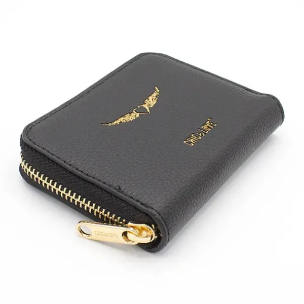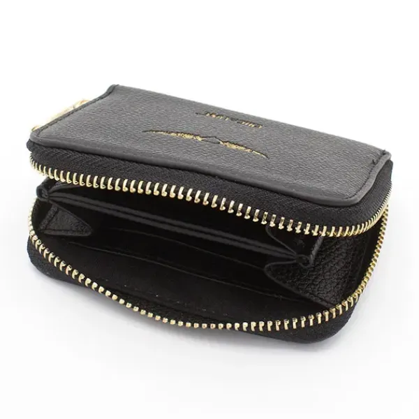 Cuenta con seis ranuras internas para tarjetas y un bolsillo central.