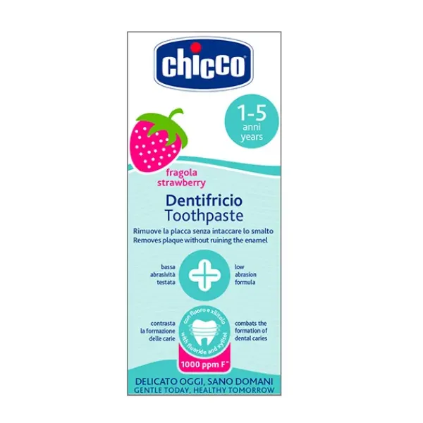 La pasta dental Chicco con flúor está especialmente formulada para la protección del esmalte dental para niños a partir de 12 meses.
