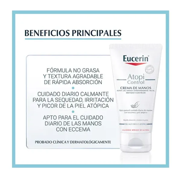 De rápida absorción Eucerin AtopiControl Crema de manos mejora la condición de la piel sin dejar una sensación de grasa.