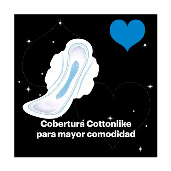 De larga duración, con alas para mantenerse en su sitio y una cobertura Cottonlike para mayor suavidad, estas compresas harán que te sientas cómoda y te permitirán dormir toda la noche sin interrupciones.