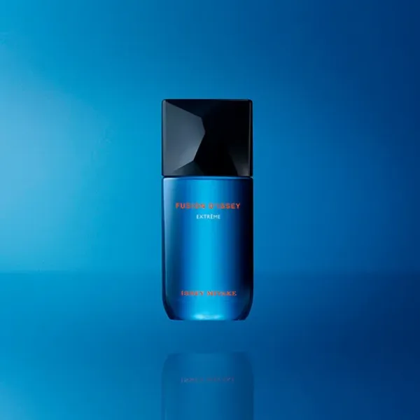 Esta fragancia volcánica se mantiene en un frasco repleta de contrastes: alta y elegante en cristal azul profundo brillante. Su tapon multifacético está esculpido con precisión para que parezca negro obsidiano. La luz brilla desde adentro, atrapada y aún vibrante. El packaging externo refleja el mismo código de color azul y negro. Además, el nombre, Fusion d'Issey está escrito en llamativas letras naranjas.