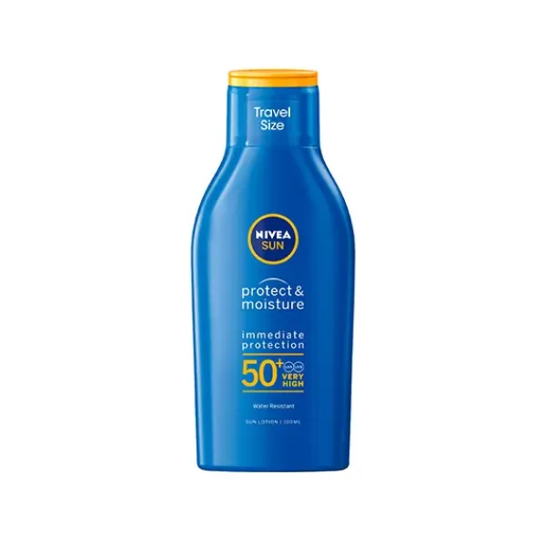 NIVEA SUN Protege & Hidrata Loción Solar Tamaño Viaje FP50+ protege la piel desde el exterior & el interior. Ofrece protección frente a los rayos UVA/UVB, las quemaduras y el envejecimiento prematuro de la piel, además de estimular la protección de la piel desde el interior gracias a la Vitamina E, un poderoso antioxidante, que activa el mecanismo de defensa de la propia piel. Además, mantiene la piel hidratada durante 48h. Su fórmula es resistente al agua, 77% biodegradable y es respetuosa con los océanos al estar libre de los filtros UV: Octinoxato, Oxibenzona y Octocrileno, además de estar libre de microplásticos. El envase está hecho con 50% plástico reciclado (botella y tapón).