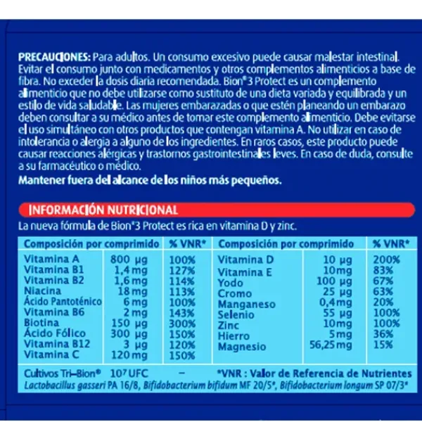 Las multivitaminas Bion3 Protect aportan 12 vitaminas, incluyendo la vitamina D, que contribuye al funcionamiento normal del sistema inmunitario; y 7 minerales, como el zinc, también contribuyendo al funcionamiento normal de nuestras defensas, y el hierro, que ayuda a reducir el cansancio y la fatiga.