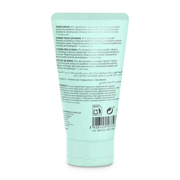 Nueva crema de manos Suavinex 75ml apta para pieles sensibles. Hidrata intensamente restableciendo la película hidrolipídica protectora después del uso recurrente de limpiadores.