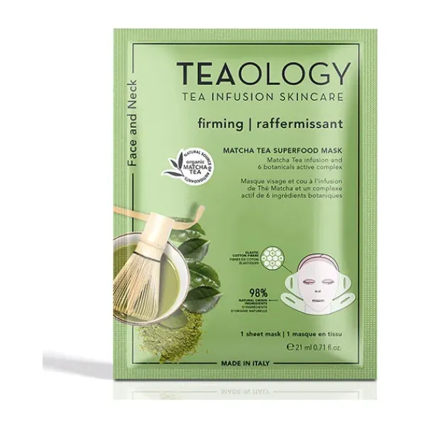 Mascarilla reafirmante para rostro y cuello en suaves fibras de algodón elásticas infundidas con té Matcha y complejo activo de 6 ingredientes botánicos.