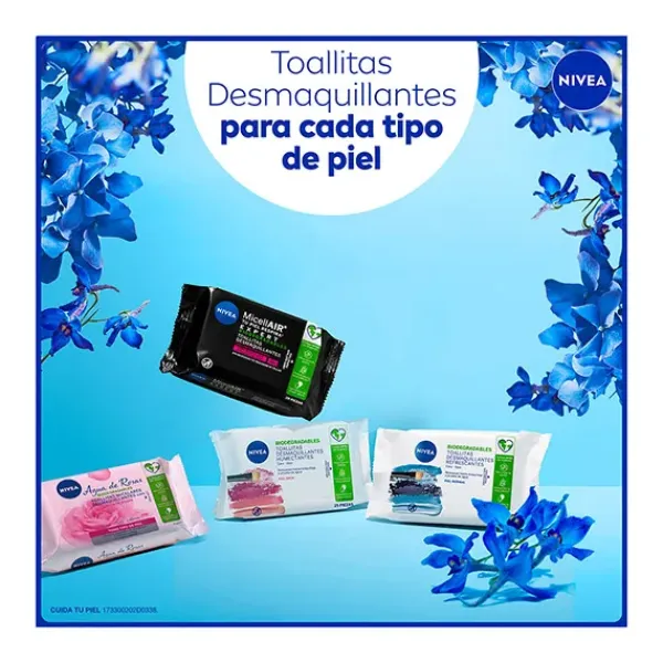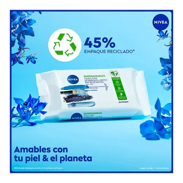 NIVEA Toallitas Desmaquilladoras Biodegradables Refrescantes 3en1 para piel normal o mixta eliminan eficazmente incluso el maquillaje y la máscara de pestañas waterproof, dejando la piel limpia y con sensación de frescor. Fórmula especialmente desarrollada para ser suave con la piel y el delicado contorno de los ojos. Fórmula con 0% alcohol y Extracto de Flor de Loto que limpia, hidrata y refresca la piel. Compatibilidad con la piel y los ojos dermatológica y oftalmológicamente comprobada.