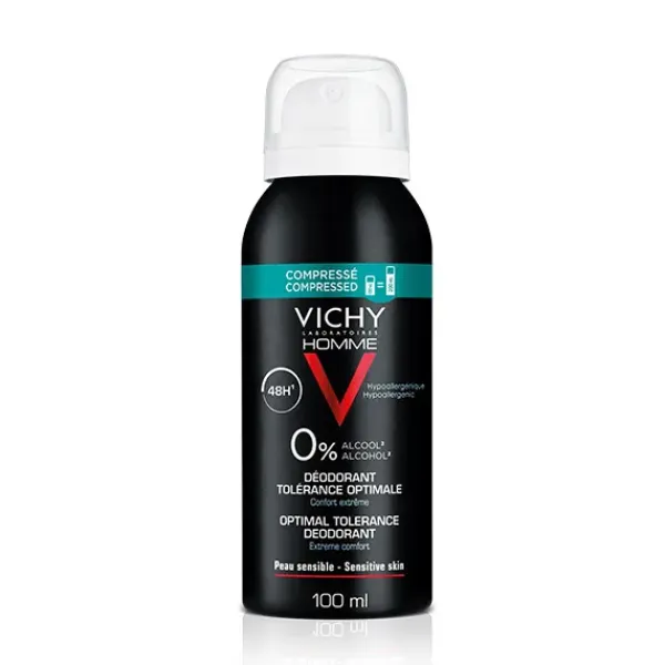 El primer desodorante 48H para hombre en spray de Vichy, hipoalergénico, con 0% de alcohol y envase reciclable ecocomprimido.