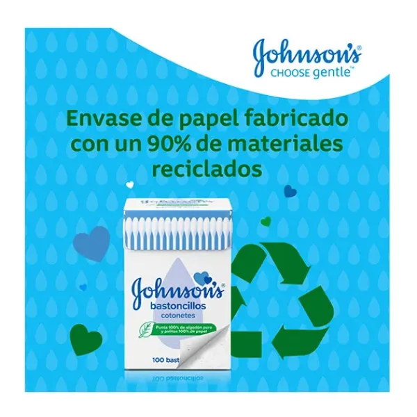 En Johnson’s Baby desarrollamos productos que son amigables con el medio ambiente, por lo que estos Bastoncillos no contienen plásticos y vienen en un envase reciclable hecho de papel que está fabricado con un 90% de materiales reciclados.