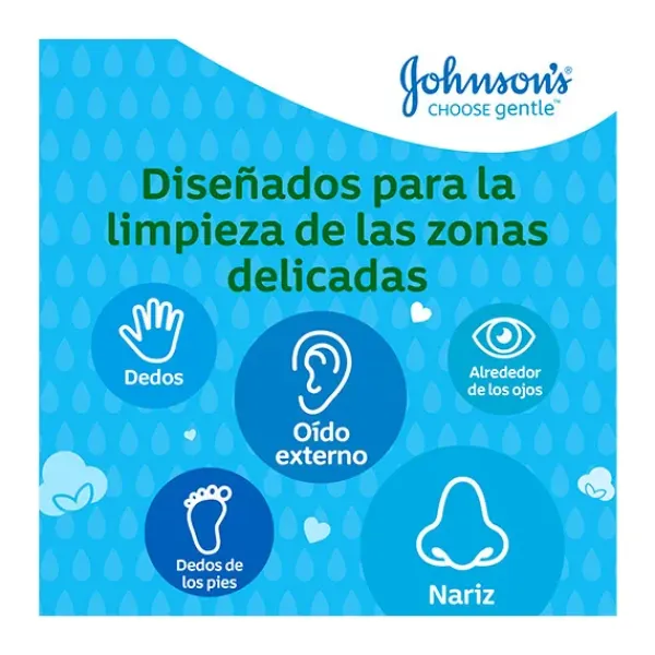 Los Bastoncillos de Johnson’s Baby están diseñados para limpiar de forma segura las zonas delicadas alrededor de los ojos y la parte externa de la oreja del bebé.