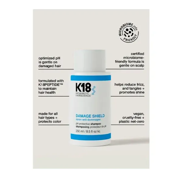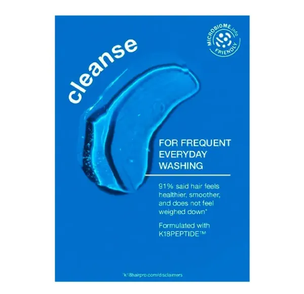 Este champú con pH optimizado reduce la hinchazón excesiva de la cutícula capilar durante el lavado para reducir daños y enredones, domar el encrespamiento y preservar el color manteniendo la salud y el brillo del cabello Está formulado con K18PEPTIDE™ para regenerar el cabello durante el lavado.