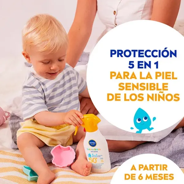 NIVEA SUN Babies & Kids Sensitive Spray Solar FP50+ proporciona una protección UVA/UVB inmediata y altamente eficaz contra las quemaduras solares y daños en la piel a largo plazo, reduciendo el riesgo de alergias solares. Su fórmula con camomila orgánica y sin perfume, desarrollada para bebés y niños con piel sensible, es extra resistente al agua y adecuada para piel atópica o propensa al eczema. Compatibilidad con la piel aprobada por pediatras.