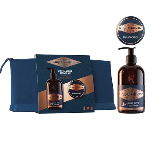 Regala King C. Gillette Beard Essentials Bag Set, con gel de lavado para barba y cara, bálsamo y peine para barba y un elegante neceser.