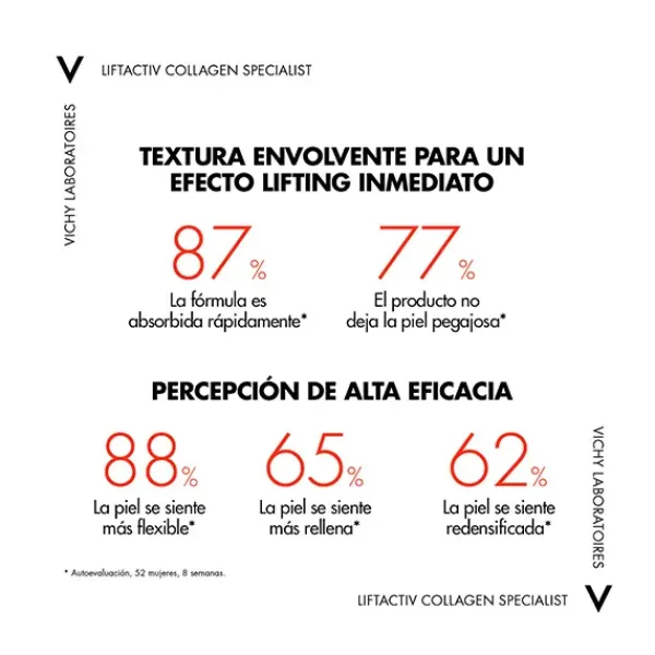 Mientras los Péptidos estimulan la síntesis del colágeno natural de la piel. Además, contiene agua volcánica de Vichy de origen volcánica, con propiedades calmantes e hidratantes para fortalecer la barrera cutánea.