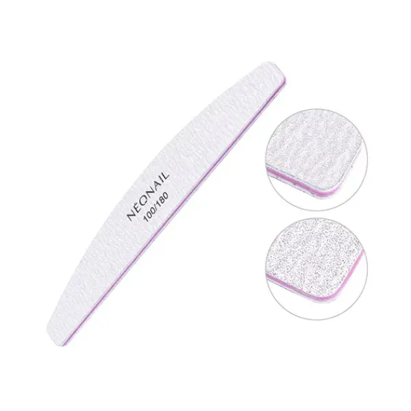 La cara del grano fino (180) es ideal para darle la forma a los bordes de la uña, mientras que la cara del grano medio (100) ayuda a retirar el diseño anterior.