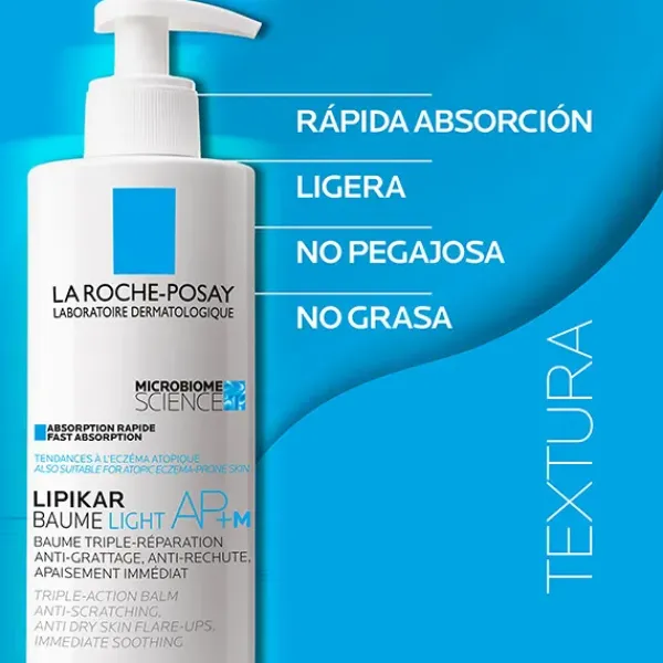 Lipikar Baume Light AP+M, bálsamo ligero de triple acción reparadora para pieles con tendencia atópica de La Roche-Posay: calma inmediatamente, reduce el picor debido a la sequedad de la piel, y espacia los brotes de sequedad severa, para una eficacia anti-reaparición. Para la piel seca, muy seca o con tendencia al picor de bebés, niños y adultos.