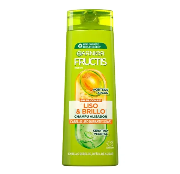 El Champú Fructis Liso & Brillo limpia, disciplina, protege la fibra capilar del encrespamiento y mantiene el liso por más tiempo sin apelmazar.