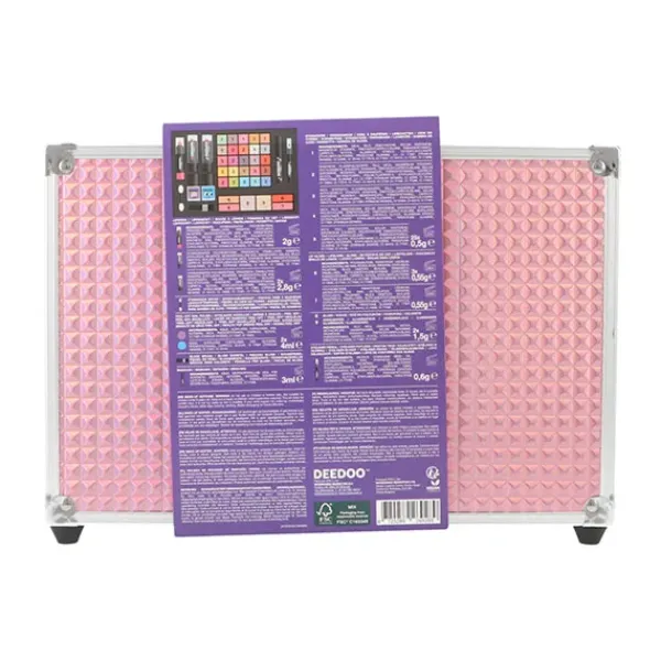 Contiene sombras de ojos, coloretes, labiales, lacas de uás, delineador, máscara de pestañas y pinceles para aplicar el maquillaje.