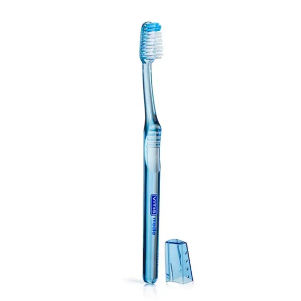 VITIS® medio es un cepillo de uso diario con un cabezal de forma diamantada que permite llegar a las zonas de difícil acceso de la cavidad bucal. Sus filamentos duros y con perfil ondulado, facilitan el acceso a a los espacios interdentales y se adaptan a la forma de los dientes.