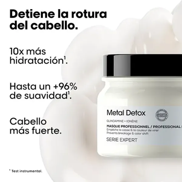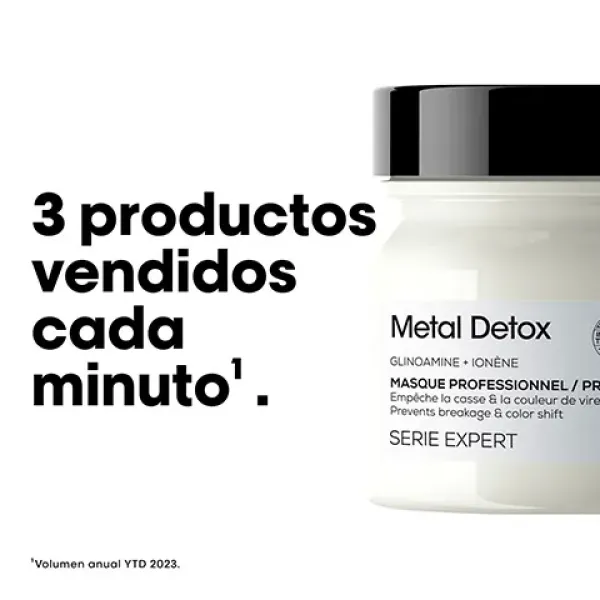 Descubre la Mascarilla Metal Detox de L’Oréal Professionnel para cabello medio a grueso, diseñada especialmente para cabello dañado, coloreado y decolorado.