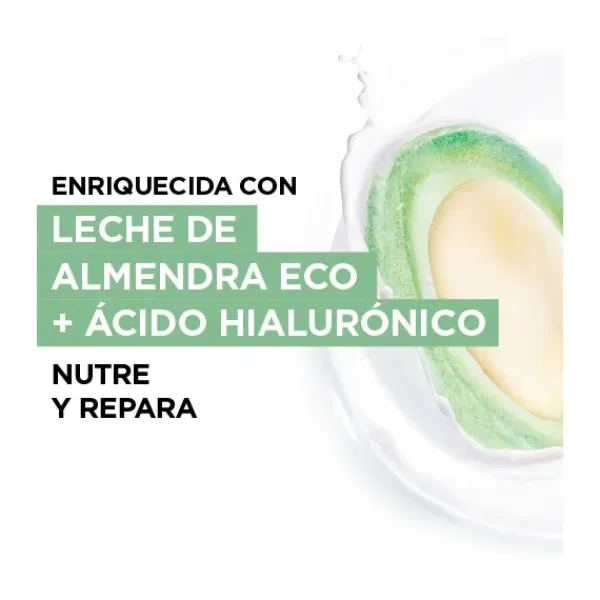 Fórmula hidratante con leche de almendra ecológica y ácido hialurónico rellenador.