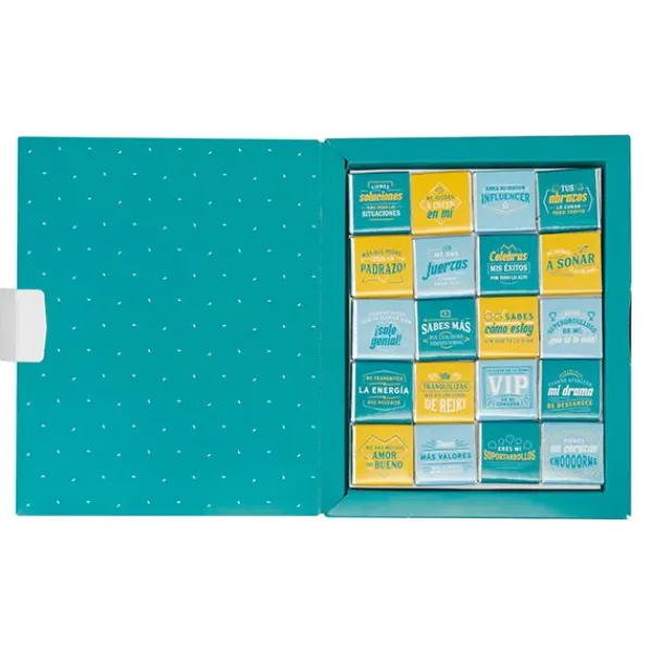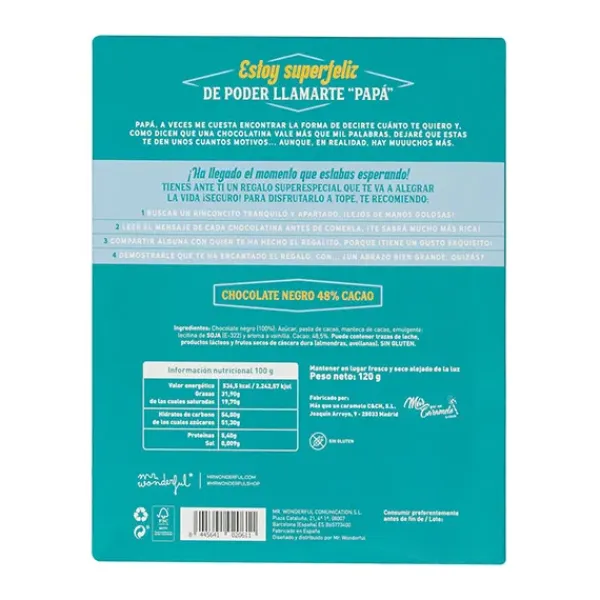 Caja con forma de librito, con 20 chocolatinas de chocolate negro en su interior y con mensaje dirigido a padres.