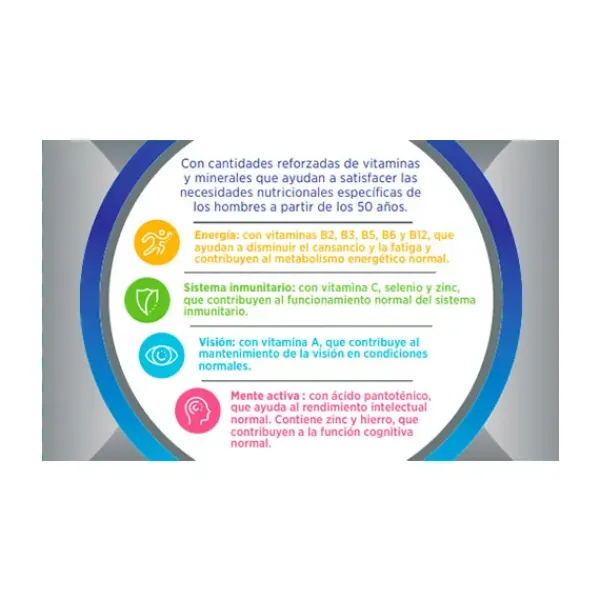 Multicentrum Hombre 50+ es un complemento alimenticio completo, con vitaminas y minerales, especialmente formulado para satisfacer las necesidades nutricionales de los hombres a partir de los 50 años.