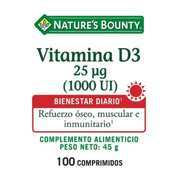 El complemento alimenticio Vitamina D3 25 Mg de Nature’s Bounty® contiene vitamina D, en la misma forma que la que se produce de forma natural en el cuerpo, como resultado de la exposición a la luz solar.
