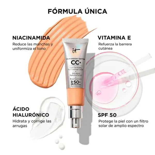 Desarrollada con cirujanos estéticos y dermatólogos, CC+ Cream de IT Cosmetics ofrece una cobertura total proporcionando a tu piel un acabado natural, cuida tu piel con un tratamiento antiedad e hidratante y la protege gracias a su filtro solar de amplio espectro con SPF 50 UVA/UVB. Para todo tipo de mujeres, sea cual sea tu edad o tipo de piel. Disponible en 13 tonos.